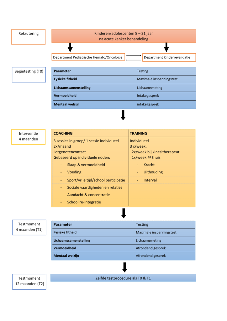 Tijdens het trainingsprogramma oefenen de deelnemers individueel 2 keer per week gedurende 45min bij de kinesitherapeut om hun conditie en kracht te verbeteren. Bijkomend wordt gevraagd nog 1 extra keer per week individueel thuis te trainen. Daarnaast krijgt elk kind gedurende het programma een sporthorloge waarmee dagdagelijkse activiteiten worden gemonitord.